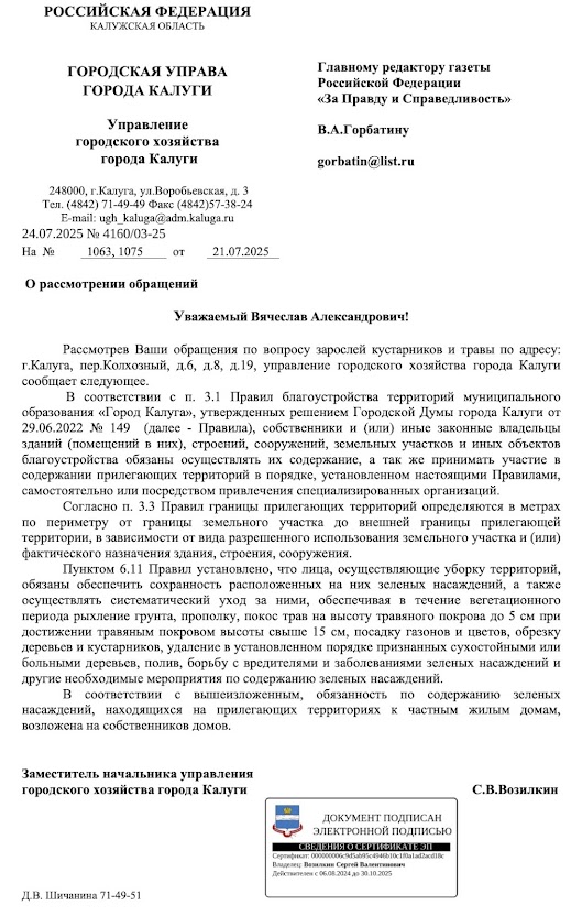 Я обращался к ВАМ с письмом 21.07. 2025 года: Это Калуга, переулок Колхозный. Справа дома №6,8,19. Заросли сузили проезжую часть улицы. Подскажите, как трактуют Правила благоустройства в городе Калуге, кто должен убирать эти заросли и можно ли убрать их в кратчайшие сроки.